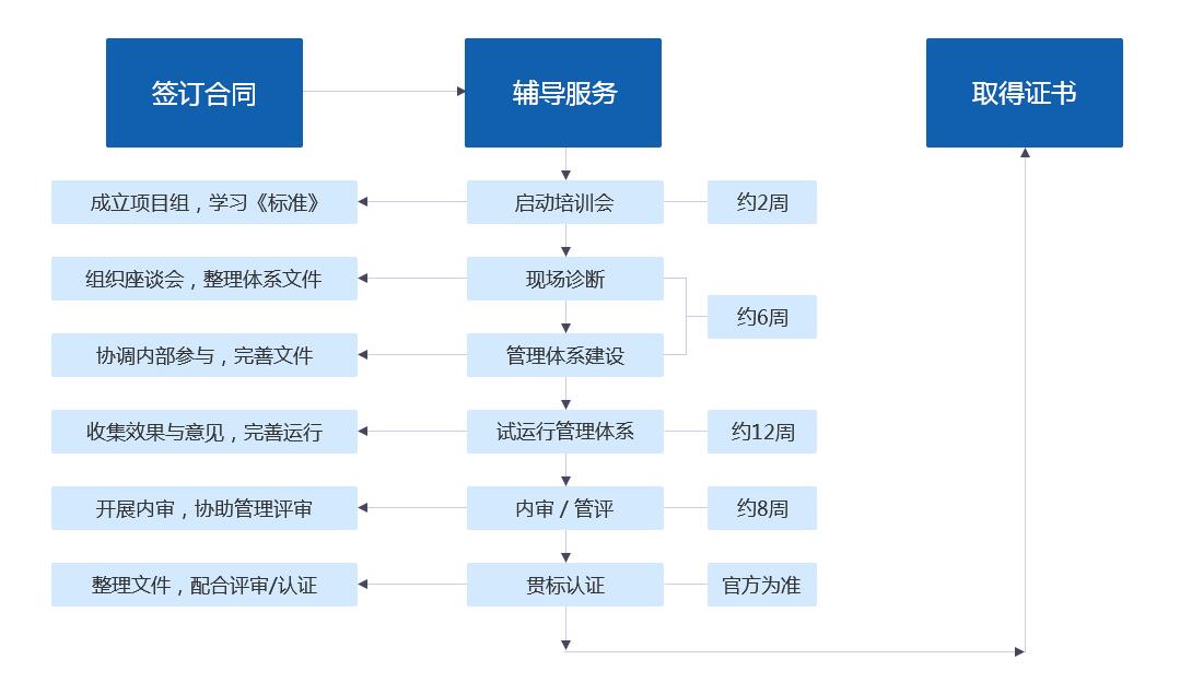 A.一般情況下6個(gè)月左右時(shí)間完成貫標(biāo)輔導(dǎo)工作,做足了準(zhǔn)備后即可申請(qǐng)認(rèn)證;認(rèn)證時(shí)間要根據(jù)認(rèn)證公司的安排而定,如兩個(gè)月到半年不等。