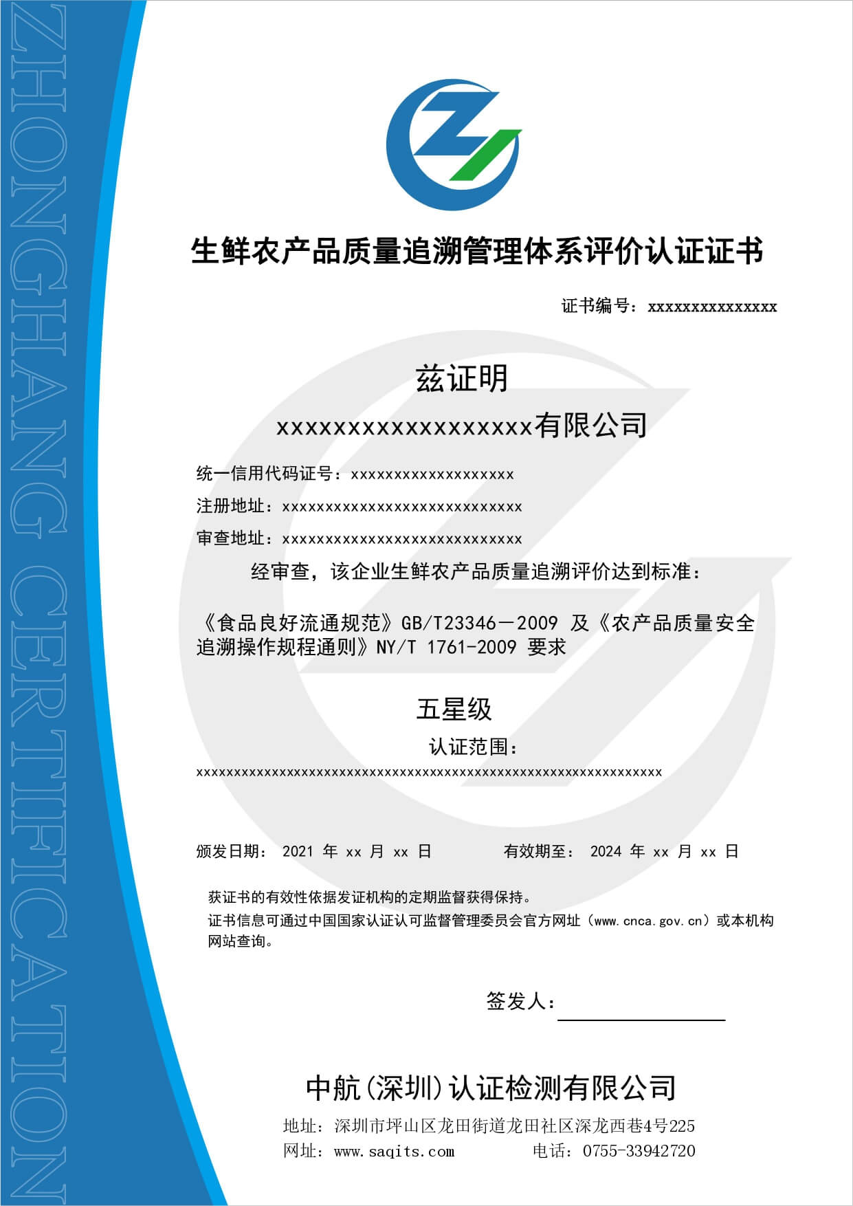 • 生鮮農產品質量追溯管理體系評價認證證書